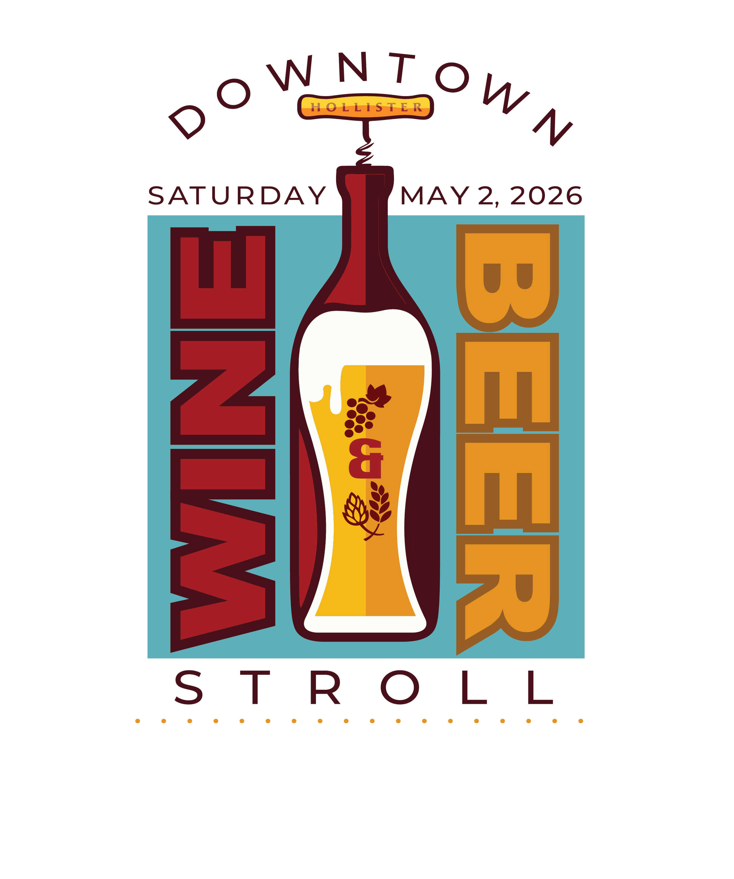 Our 13th Annual Downtown Wine & Beer Stroll takes place in Downtown Hollister on Saturday, May 2nd, 2026 from 1:00 - 5:00. Participating businesses will be paired with a local winery or brewery where attendees will be poured a 1 oz. taste of wine OR a 2 oz. taste of beer.