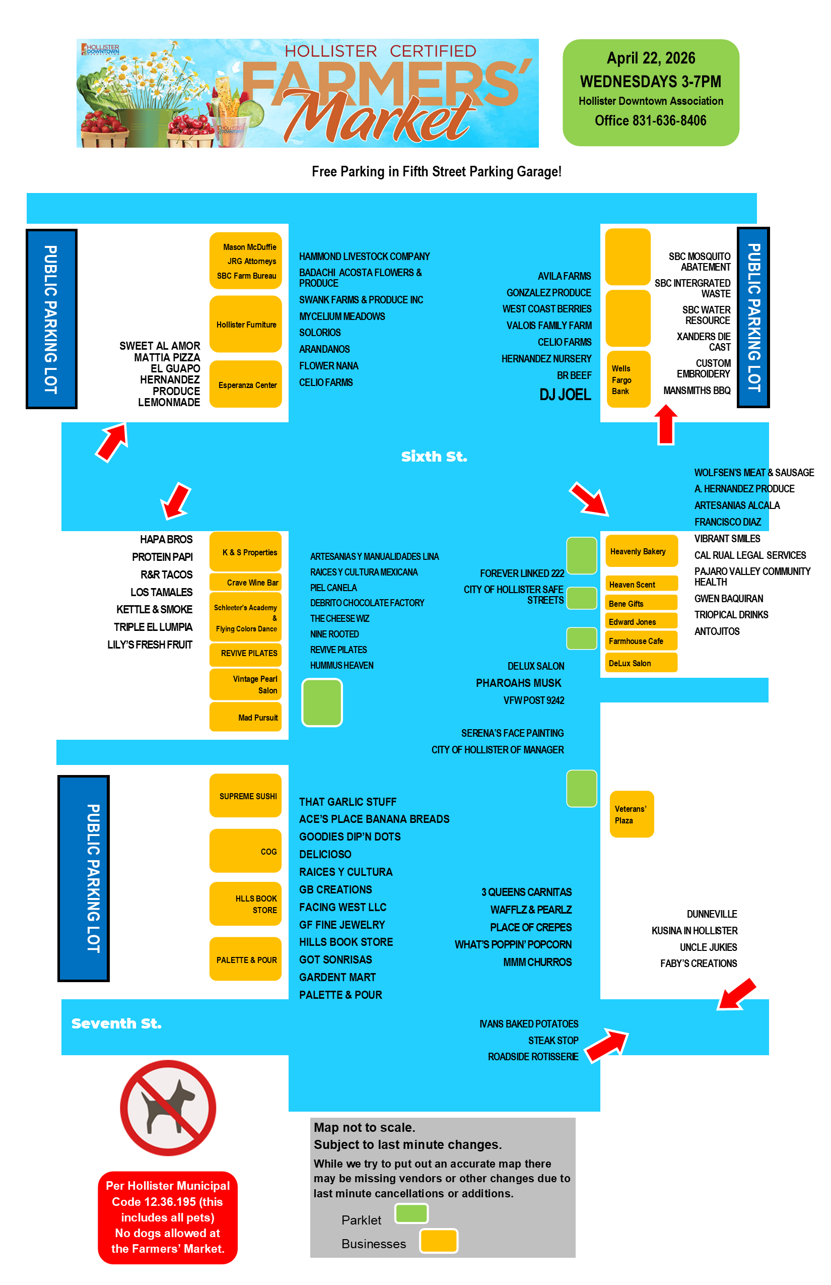 NO PETS RULE: We LOVE our pets too, but the California Department Of Health strictly forbids pets in any open food facility, including all farmers' markets. A working service animal that is specifically trained to provide assistance to an individual with a disability is permitted. Emotional support animals are not recognized by the ADA and therefore are not exempt.